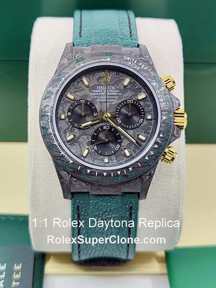 | Please Note: This is a Custom Made Rolex Daytona Super Clone made of Real forged Carbon Fiber. The use of Carbon case makes this watch the lightest Daytona ever produced | |