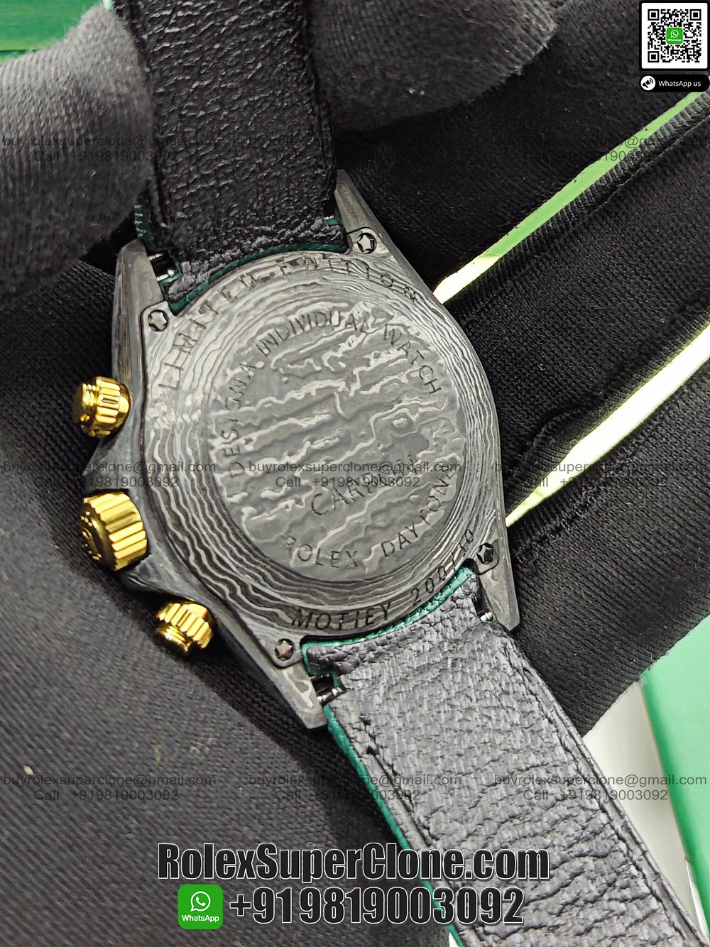 | CASE | – 40mm Oyster Case made of real Carbon Fiber – It is the Lightest Daytona ever produced with less than 50 grams of weight – Screw-Down Winding Crown – ROLEX ROLEX Laser Engraving on Rehaut Ring with Correct Alignment – Dimensions and Weight is Exact 1:1 Identical with Original |