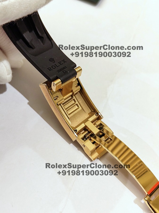 | BRACELET | – OysterFlex Rubber Strap – Rubber Strap Serial Number and ‘Rolex’ and ‘OysterFlex’ engravings exactly like Original – 18k Yellow Gold Plated 904L steel Folding OysterLock Safety Clasp with GlideLock Extension System, exactly as Original |