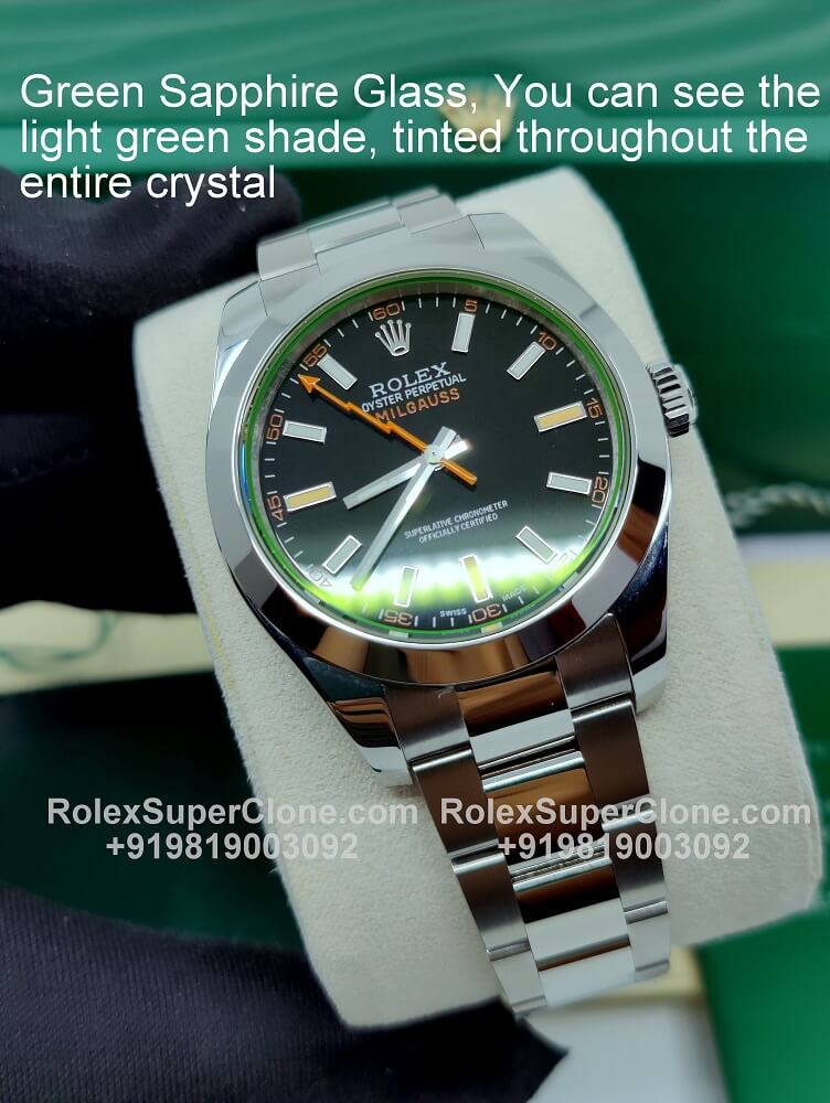 | CRYSTAL | – Green Sapphire, Scratch-resistant Glass – Laser etched small Rolex Crown Logo at 6 o’clock |